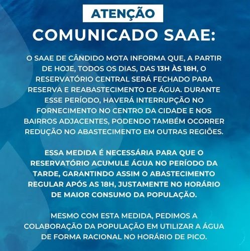 O SAAE de Cândido Mota informa que, a partir de hoje (01/10), 𝘁𝗼𝗱𝗼𝘀 𝗼𝘀 𝗱𝗶𝗮𝘀, 𝗱𝗮𝘀 𝟭𝟯𝗵 𝗮̀𝘀 𝟭𝟴𝗵, o reservatório central será fechado para reserva e reabastecimento de água. Durante esse período, haverá interrupção no fornecimento no centro da cidade e nos bairros adjacentes, podendo também ocorrer redução no abastecimento em outras regiões.